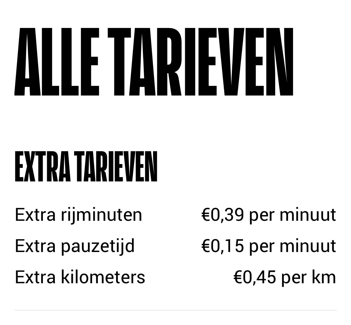 En dan….is Check echt de goedkoopste? Dat is lastig te beoordelen. Want de opbouw van prijs wist ik niet te ontcijferen. In de app staat hier ook geen info over. Bij ‘alle tarieven’ staan alleen de extra’s; rijminuten, pauzetijd en kilometers. Het lijkt er dus op dat de prijs wordt opgebouwd met een tarief dat differentieert tussen rijdende tijd en stilstaande tijd. Maar hoe de € 3,10 per/uur tot stand komt? Geen idee. Om achter de prijs te komen, voer je dus jouw gewenste huurtijd en kilometers in en dan verschijnt er een getal. Check zelf noemt dit een nieuwe functie ‘stel je eigen rit samen’ en heeft dit ontwikkeld op basis van gebruikersfeedback. Jammer, want dit is niet zo transparant en een duidelijk inzicht in kostenopbouw werkt voor mij juist erg prettig.