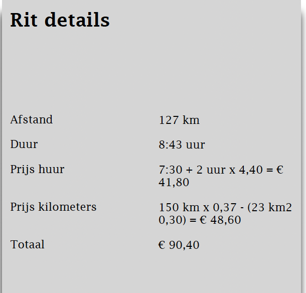 A: Je koopt 100 km in à € 38 en rijdt er 115. Dan betaal je € 5,70 extra en kom je uit op € 43,70.